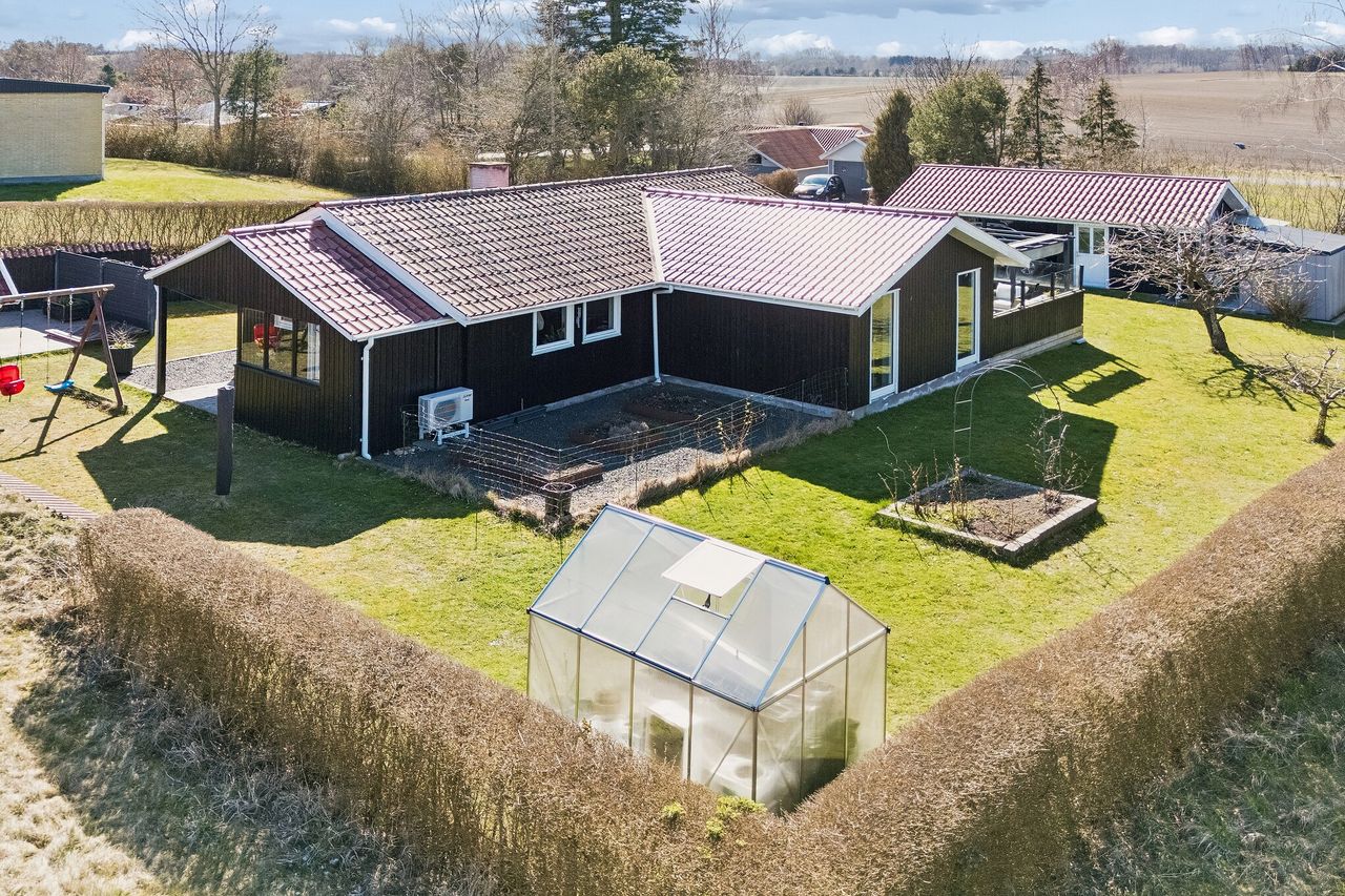 Ejendommen byder desuden på skønne udendørsfaciliteter. Her finder du 2 terrasser, bålhytte, højbede, drivhus, legehus, to skure og en carport. Derudover følger røgeovn og hemmeligt rum til kolde drikkevarer på terrassen. Robotplæneklipper kan indgå i handelen.