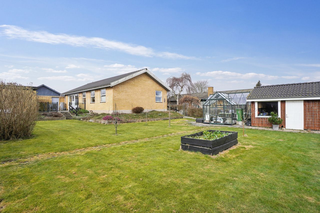På grunden findes drivhus/væksthus og godt og rummeligt udhus, som er delvist isoleret. Endvidere garage med elport.